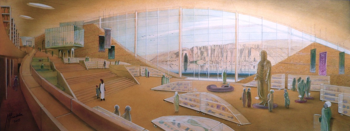 The Bamiyan Cultural Centre is a bridge, because it connects past and future, allowing visitors to walk on its roof, reaching the great Buddah Cliff view in permanent dialogue with the valley's history. The building develops a single space, following the rich sheltered bazaar typology: this honours one of the most important eastern anthropological qualities that explains the islamic spirit: the journey. A grand amphitheater, articulating the upper and the lower site levels, transforms the Valley in a natural stage. After passing the gate, visitors walk by the 34 Provinces Park, reaching the columnated lobby, hall, Performing wing, Amphitheater (outdoors), and Exhibition wing. Visitors submerge in a trip, softly descending through exhibition terraces: Information, Tea House (Glass Cube), Permanent Exhibition, Research, Library, Quiet Rooms, finally reaching the lower level with temporary collections; there they watch the Buddah Cliff -mirrored on a water pool- through the large curved window.