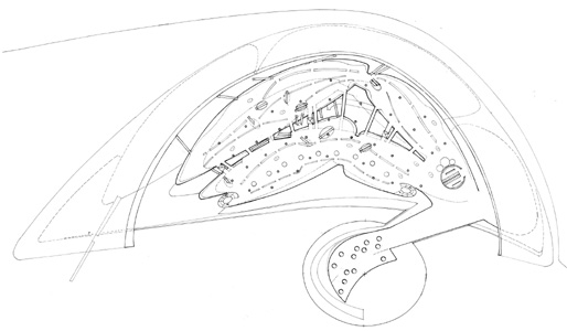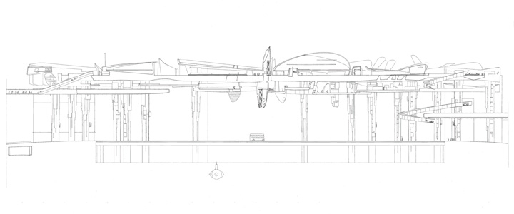 Bird's eye axonometric (pencil on heliographic copy from ink on tracing paper). 3m x 1.1m Copyright © 1992 PPPouchulu.
