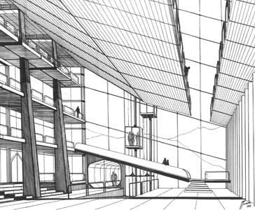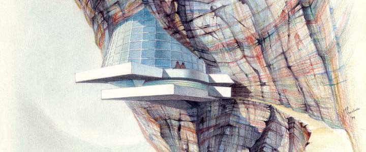 Perspective of interior space towards the West. Mountains in the foreground. (ink on canson). Copyright © 1983 PPPouchulu.
