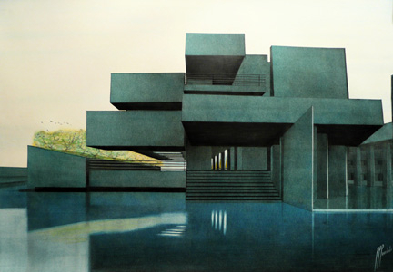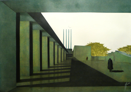 The drawings show a quiet but intriguing space, somehow they guess about a closer future in a sort of "post-apocalyptical" way: greenish and bluish glossy concrete and steel surfaces appear in backlight, expressing a desire for an eternal existence.